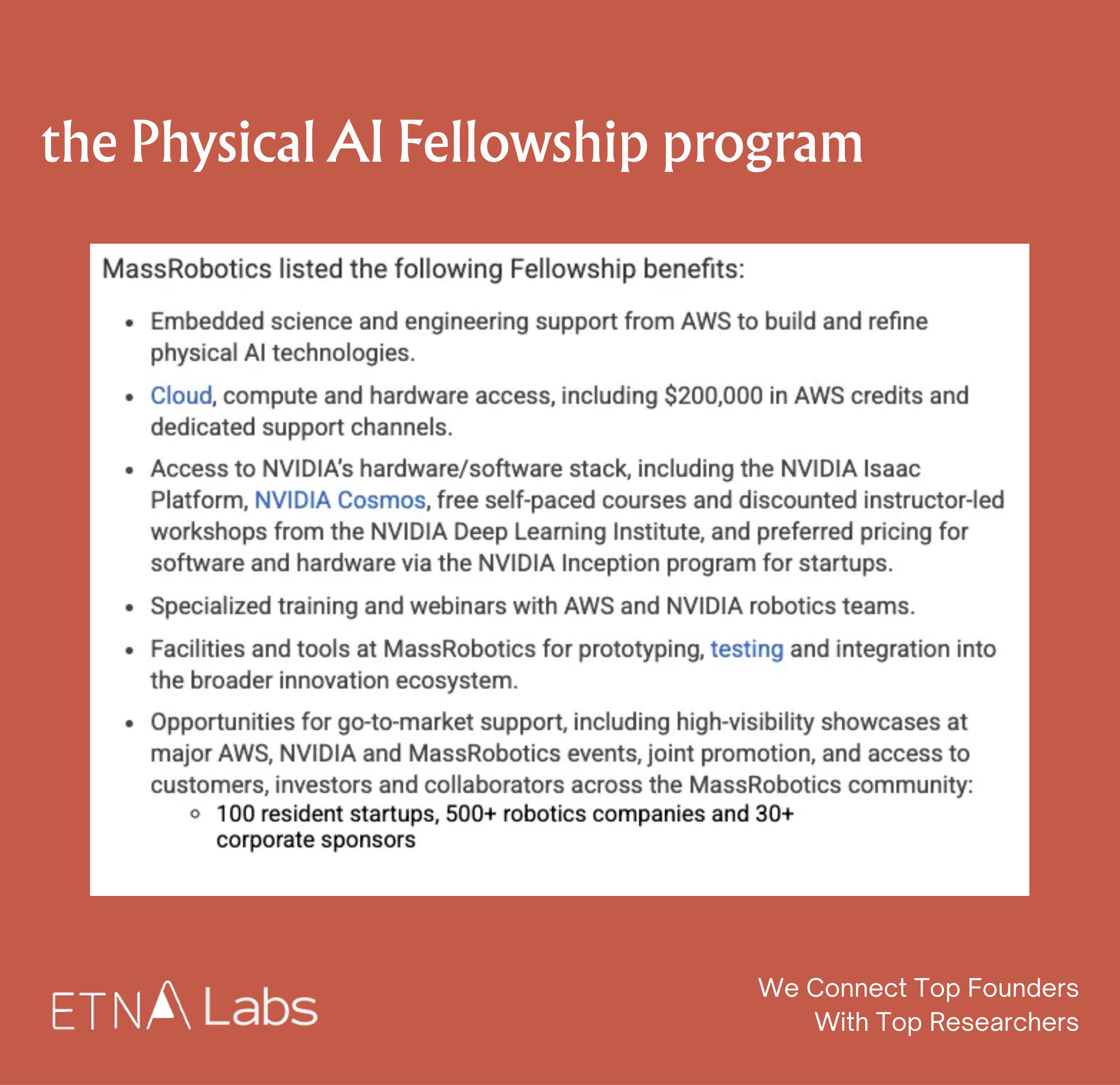 The program launched by MassRobotics in collaboration with AWS and NVIDIA Inception, aims to accelerate the development of startups in the field of Physical AI by providing technical resources. Selected companies primarily receive the following support: