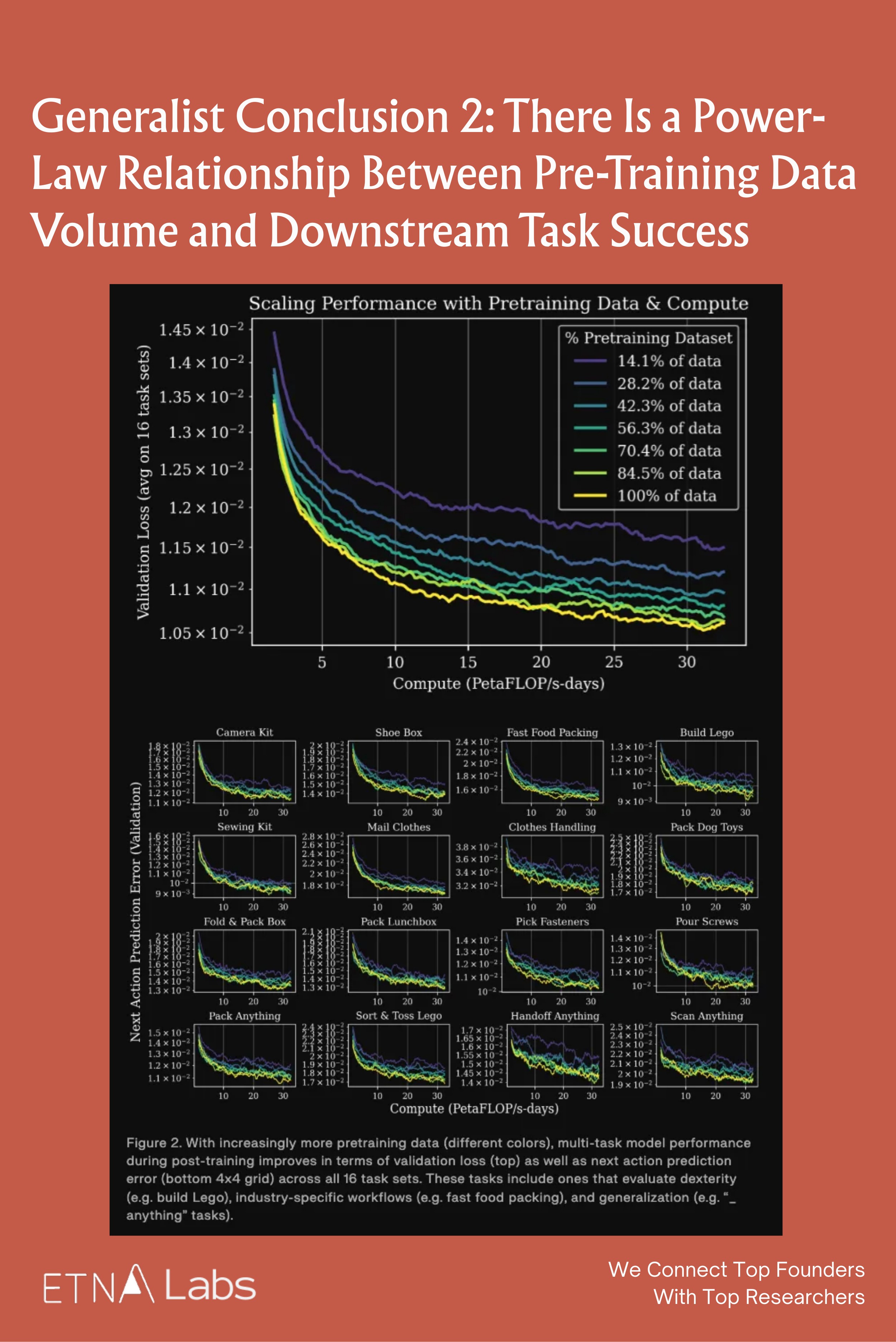 In terms of model metrics, the team selected model checkpoints trained with varying amounts of pre-training data and performed multitask supervised fine-tuning across 16 different task sets. The results show that the more pre-training data used, the lower the validation loss and next-step action prediction error of the downstream models across all tasks.
