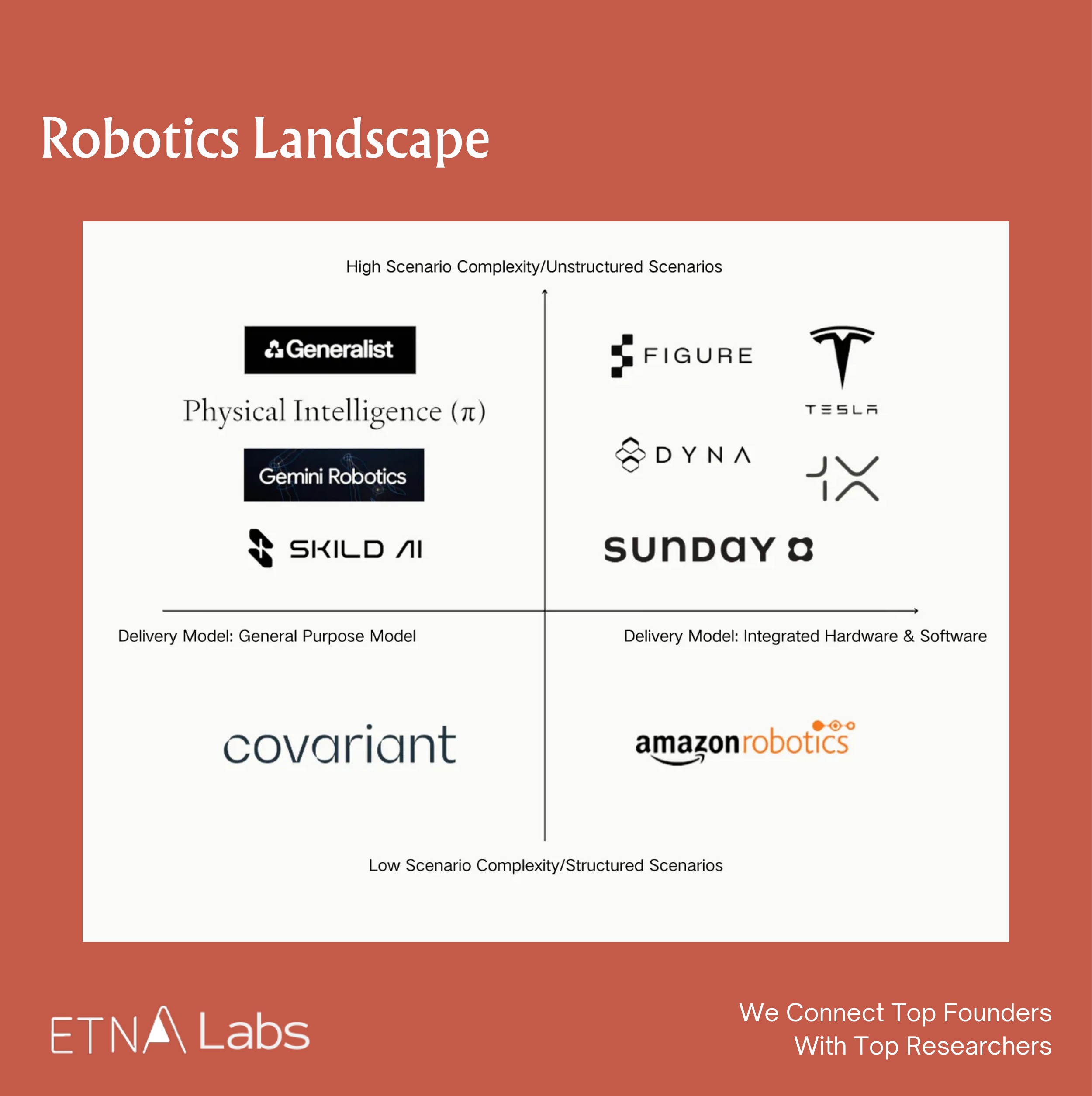 There are numerous startups in the robotics field. If scene complexity is plotted on the vertical axis and delivery format on the horizontal axis, a rough quadrant map of the robotics industry can be drawn. In the past, market attention was primarily focused on the lower half, covering relatively structured environments such as factories and logistics, where task determinacy was higher. With the development of LLMs, market focus has shifted toward the upper half.
