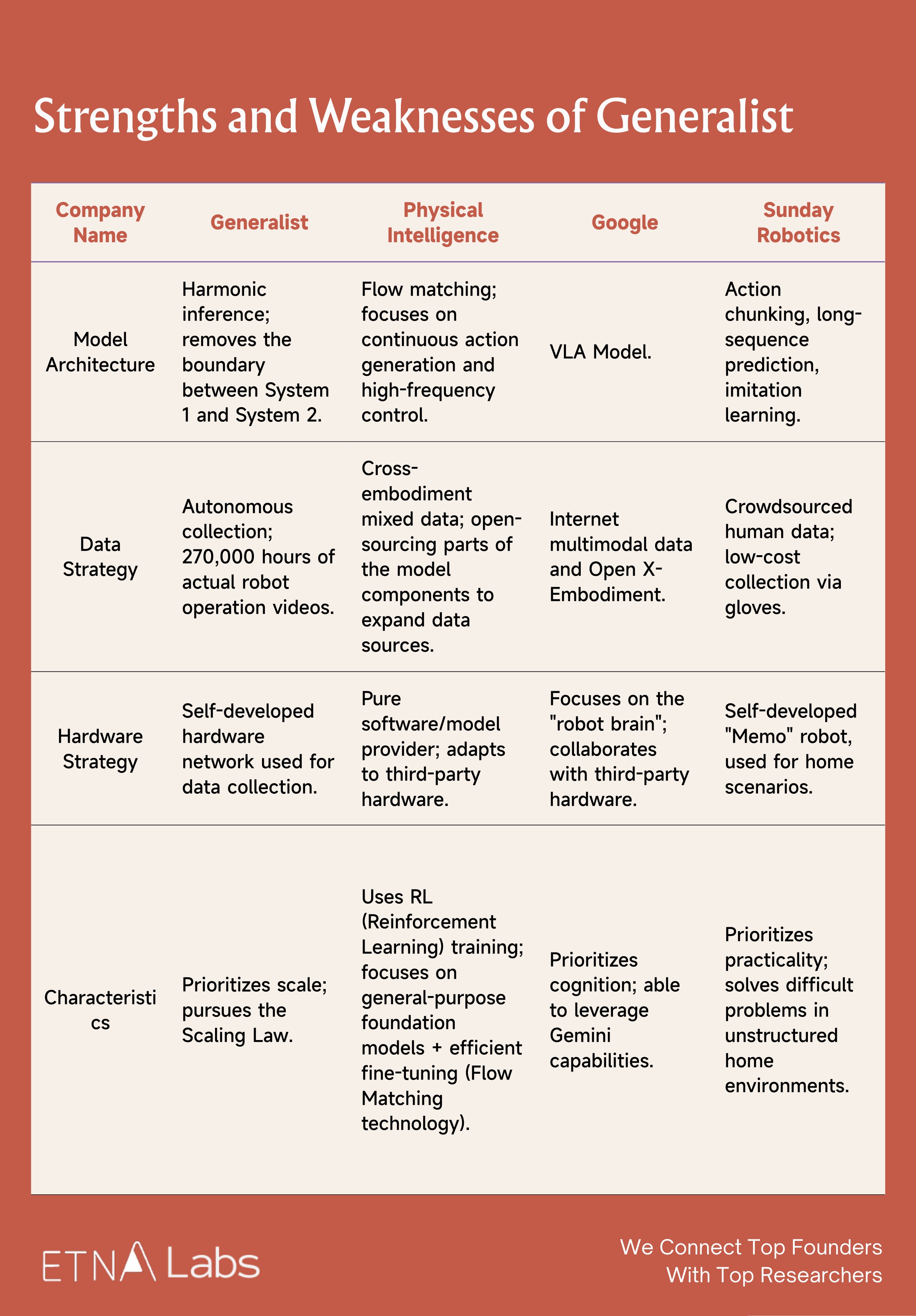 As a newly established general-purpose robotic brain company, Generalist is positioned in Quadrant II. Overall, Generalist's greatest moat remains its large volume of end-to-end real-world robot data and extremely strong technical team. However, it also faces significant competitive pressure: Physical Intelligence has a more complete team structure and has recently completed substantial funding; Google possesses massive TPU compute resources and financial backing, as well as the ability to leverage the Gemini model; Sunday, meanwhile, achieves faster deployment in home environments.