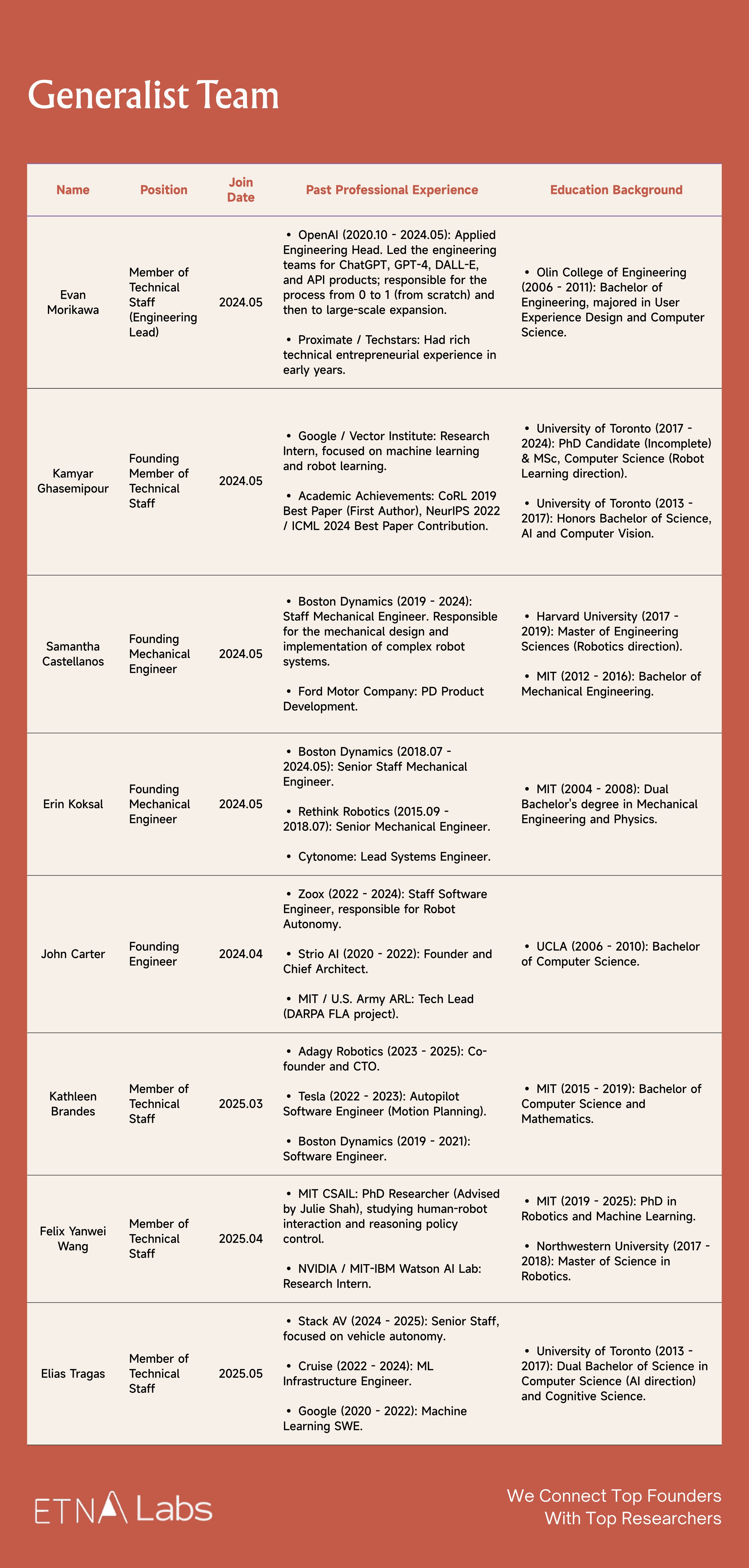 Generalist team members come from institutions such as OpenAI, Boston Dynamics, and Google DeepMind. Prior to joining Generalist, some members participated in the research and release of models like PaLM-E and RT-2, were responsible for scaling ChatGPT and GPT-4 to hundreds of millions of users, or were involved in the development of key autonomous driving technologies and robotic systems such as Atlas, Spot, and Stretch.