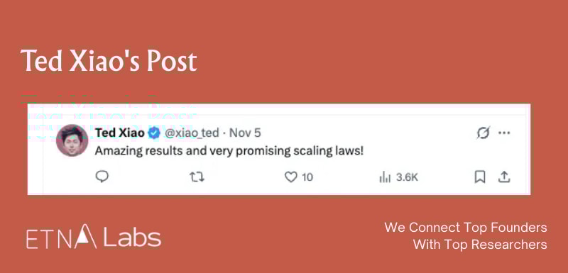 In November last year, Generalist claimed to have validated a scaling law analogous to that of language models for the first time in the robotics domain, whereby downstream task performance exhibits a predictable power-law improvement as pre-training data and compute increase. International social media largely regarded this as a significant breakthrough. Ted Xiao, a former Google DeepMind scientist who participated in projects such as Gemini Robotic, RT-2, RT-1, and SayCan, described the result on Twitter as very promising.