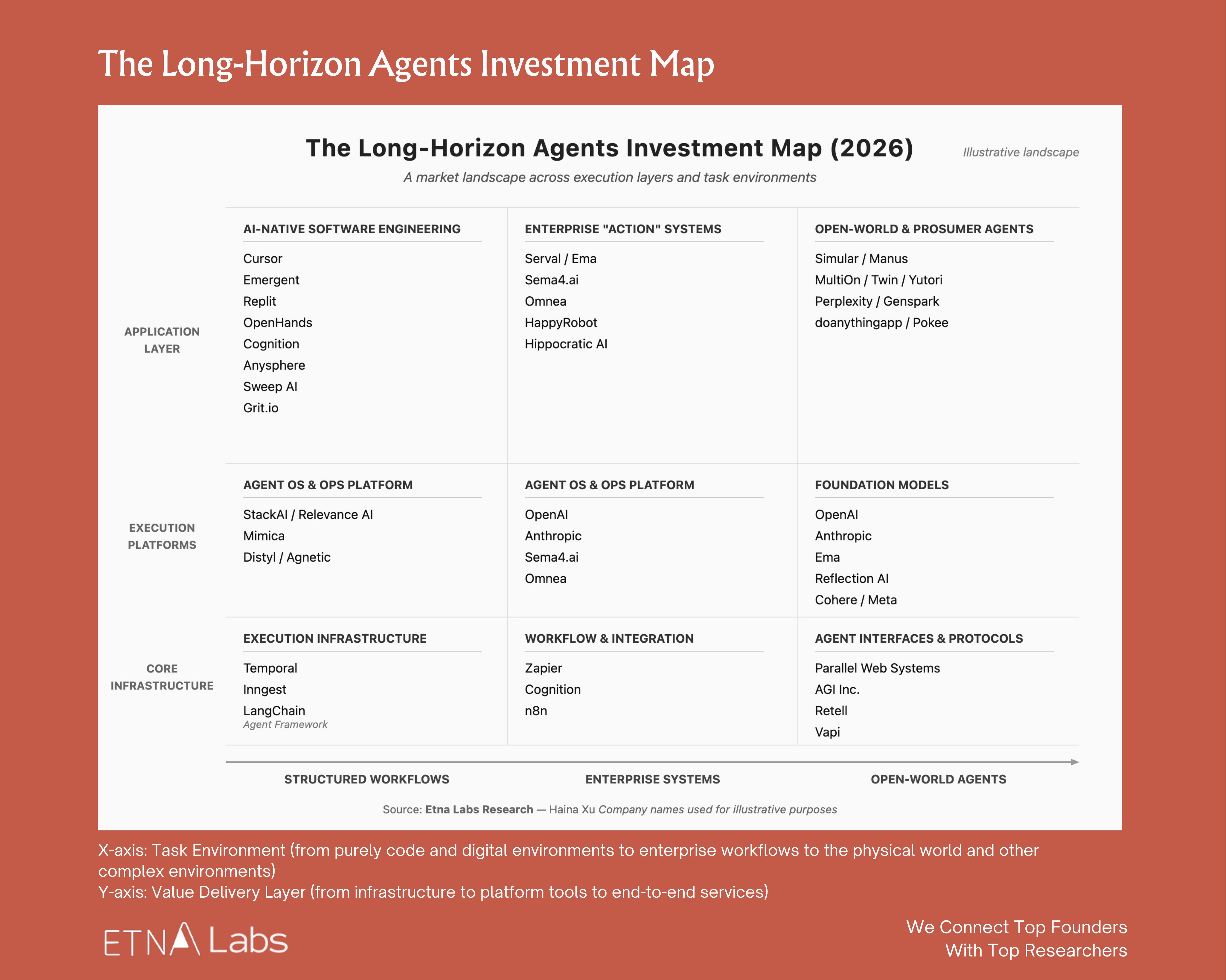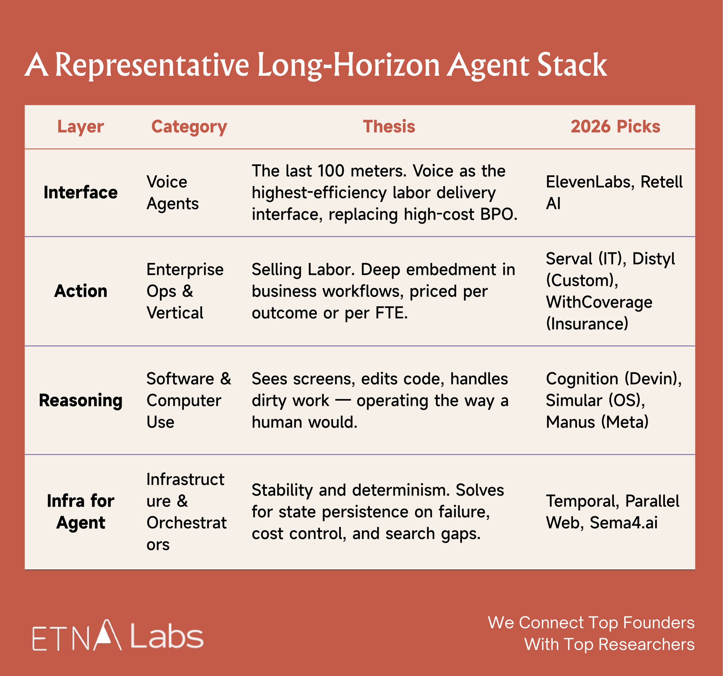 The central question for agents in 2026 is where value accretes in the stack. We focus on companies leveraging long-horizon capability to solve high-value commercial problems.